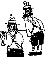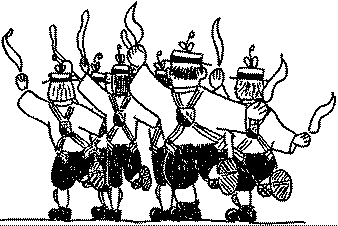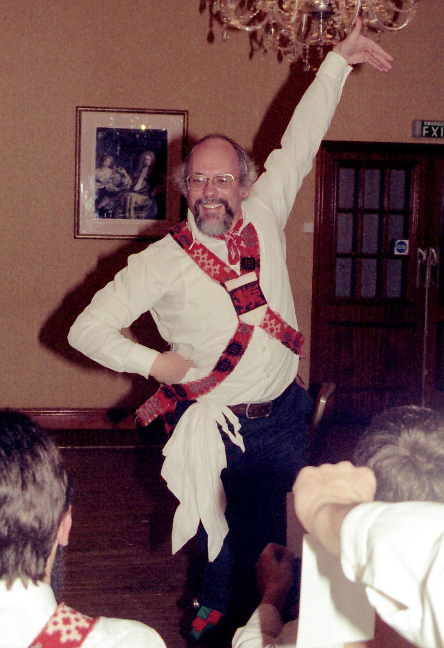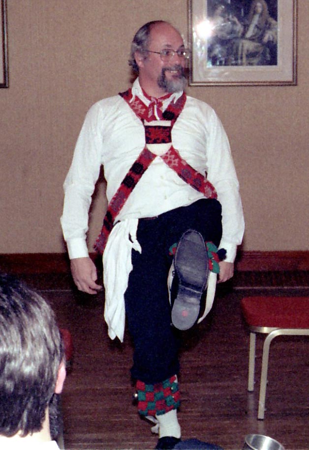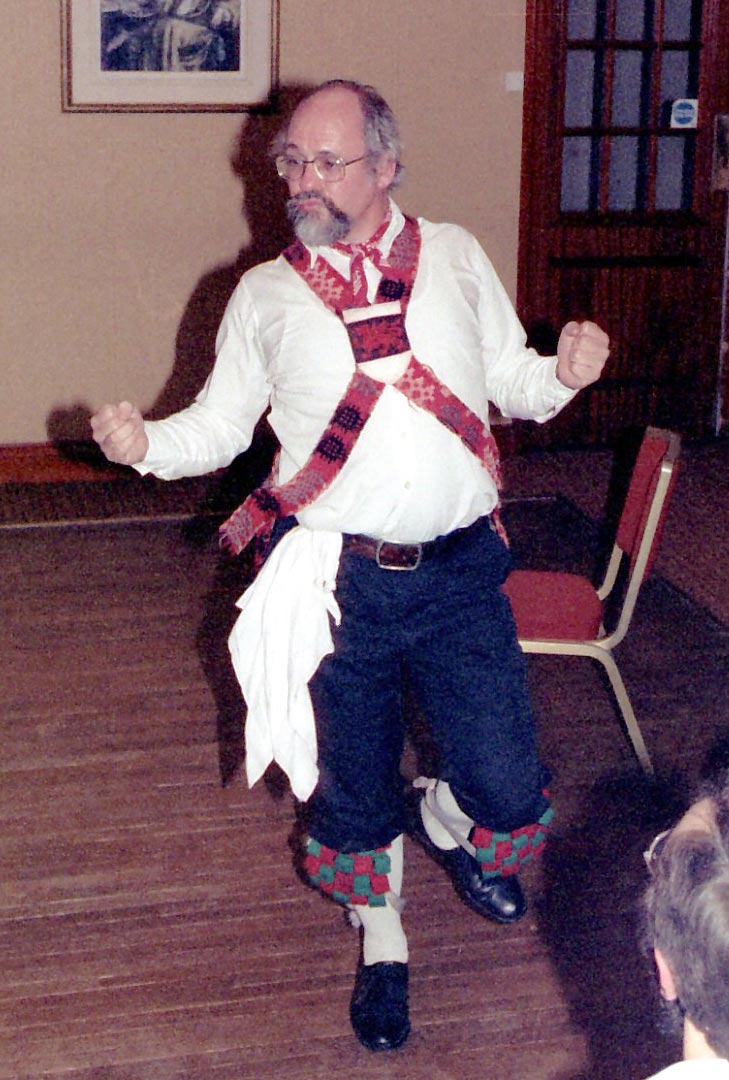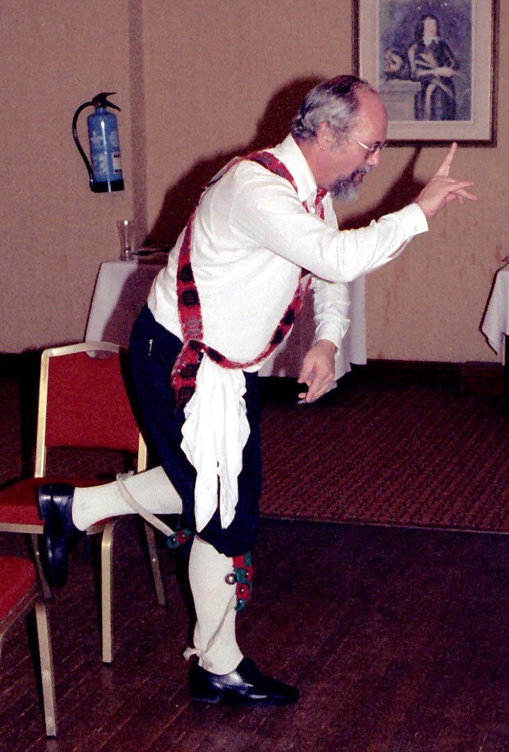 On a subsequent journey to Oxford where he was to instruct the learned minds of the day on "How to Manufacture a Motor Car", a concept which, incidentally, it took the dullards centuries to put into practice, Dai passed twice through the villages of Cotswold England. He was there so moved by the misery and depression brought about by the total absence of culture of any sort that he paused to take small groups of six or so to one side and teach them to dance in his virtually inimitable manner. Then as now, the personal habits of the English were far from sanitary, so the only provision Dai insisted upon was that they wave handkerchiefs to waft as much fresh air to him as possible. As you can see, the practice has persisted despite being nowadays, in the main, unnecessary. Some dances of course celebrate Dai's memory by replicating his great walking stick, waving it about and hitting things with it, as he was himself inclined to do upon being asked to vacate a Public House.